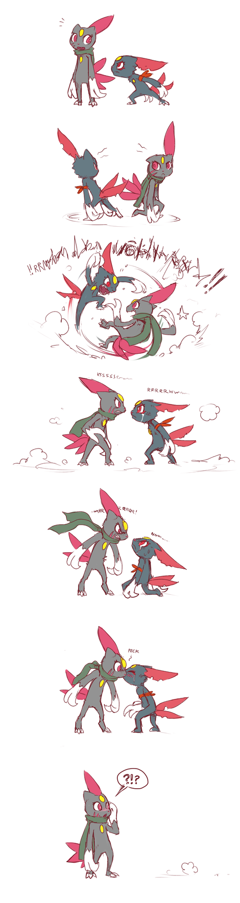 The sneasel with the scarf is a PMDE npc named Rhodes, a character whom served as one of the basis for Sundance's design. Sundance believes he was partially responsible for his old gang leader's death and does not like him at all.