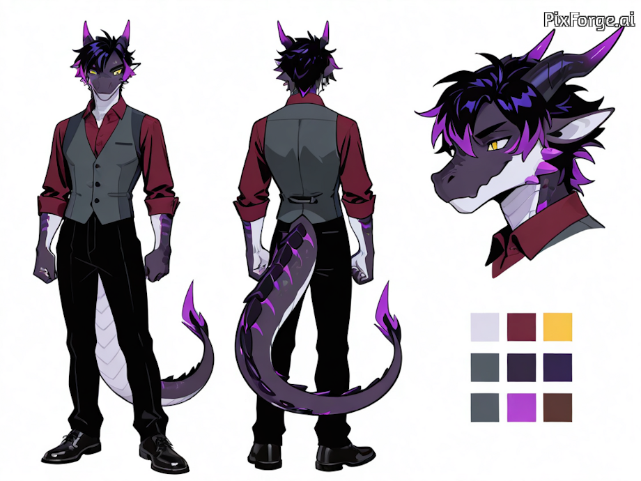 Has black hair with purple highlights, golden yellow eyes, and purple scales.