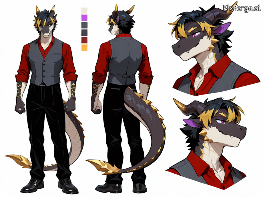 Has black hair with yellow highlights, purple eyes, and golden yellow scales.