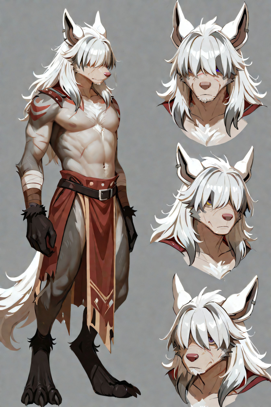 HYPERREALISM, masterpiece, high quality, detailed fur, high detail, 32k_uhd, fine details, intricate details, highest quality, perfect anatomy, perfect face, detailed face, detailed eyes, perfect eyes, very aesthetic, concept art, masterpiece, best quality, amazing quality, ultra-HD, high resolution, ultra-detailed, absurdres, highly detailed, detailed eyes, source_furry, no lineart <lora:(1) FenrisXL Lighting:1> <lora:(1) Mjölnir (SDXL Lighting):1> <lora:photorealistic anthro 2:1> furry (solo, 1boy:1.4) (pelvic curtain, full body, emotionless:1.5) <lora:character_Sheet_XL:0.8> character sheet, Multiple views, simple background multiple expressions, different emotional expressions, looking at viewer <1pur4> (elderly, old:1.5) (male:2) (male:anthro:athletic:mightyena:1.6) (long hair, white hair, white beard, gray highlights, hair over eyes:1.4), (wrist tuft, ankle tuft, chest tuft, chest hair:1.5), (gray fur:1.4), (red markings, tribal markings:1.3), (digitigrade:1.3) (long arms, clawed toes:1.4), (wrinkles,scars:1.4) Negative prompt: bloodshot eyes, arms behind back, hands behind back, blurry, blurry background, bad anatomy, bad hands, three hands, three legs, bad arms, missing legs, missing arms, poorly drawn face, bad face, fused face, cloned face, worst face, three crus, extra crus, fused crus, worst feet, three feet, fused feet, fused thigh, three thigh, fused thigh, extra thigh, worst thigh, missing fingers, extra fingers, ugly fingers, long fingers, horn, realistic photo, extra eyes, huge eyes, 2girl, amputation, disconnected limbs, worst quality, normal quality, low quality, low res, blurry, text, watermark, logo, banner, extra digits, cropped, jpeg artifacts, signature, username, error, sketch ,duplicate, ugly, monochrome, horror, geometry, mutation, disgusting, jpeg artifacts, , NEGATIVE_HANDS ac_neg2 p0rnXL-neg DeepNegative_xl_v1 BeyondV3-neg Steps: 30, Sampler: DDIM, Schedule type: SGM Uniform, CFG scale: 3, Seed: 3175937210, Size: 512x768, Model hash: 1a859ef789, Model: NOVAYiffymix_v62, Denoising strength: 0.25, ADetailer model 2nd: face_yolov8s.pt, ADetailer confidence 2nd: 0.3, ADetailer dilate erode 2nd: 4, ADetailer mask blur 2nd: 4, ADetailer denoising strength 2nd: 0.4, ADetailer inpaint only masked 2nd: True, ADetailer inpaint padding 2nd: 32, ADetailer version: 25.3.0, Hires upscale: 1.5, Hires steps: 20, Hires upscaler: 4xUltrasharp_4xUltrasharpV10.pth, Lora hashes: "(1) FenrisXL Lighting: c49df8024095, (1) Mjölnir (SDXL Lighting): 368d428918ac, photorealistic anthro 2: bed53d4c8b68, character_Sheet_XL: 4c59246e5115", TI: "NEGATIVE_HANDS, ac_neg2, p0rnXL-neg, DeepNegative_xl_v1, NEGATIVE_HANDS, ac_neg2, p0rnXL-neg, DeepNegative_xl_v1", Version: f2.0.1v1.10.1-previous-224-g90019688 |