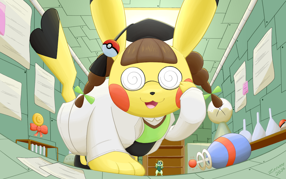 After a serie of test looks like Pikachu PhD found out how to make a Size Ray with the help of a now smol Floragato, apparently she only worked on the shrink part of it, so he will have to wait a bit before go back to normal, if she ever does work on that...