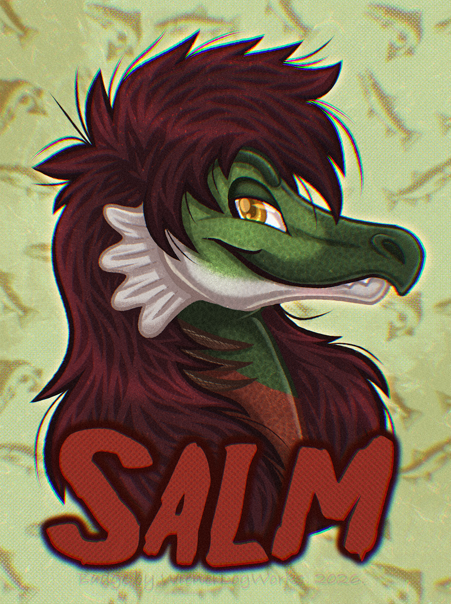 A completed shaded digital badge done for SalmTheSalmon for the ConBadge Exchange on FurAffinity! 🐟