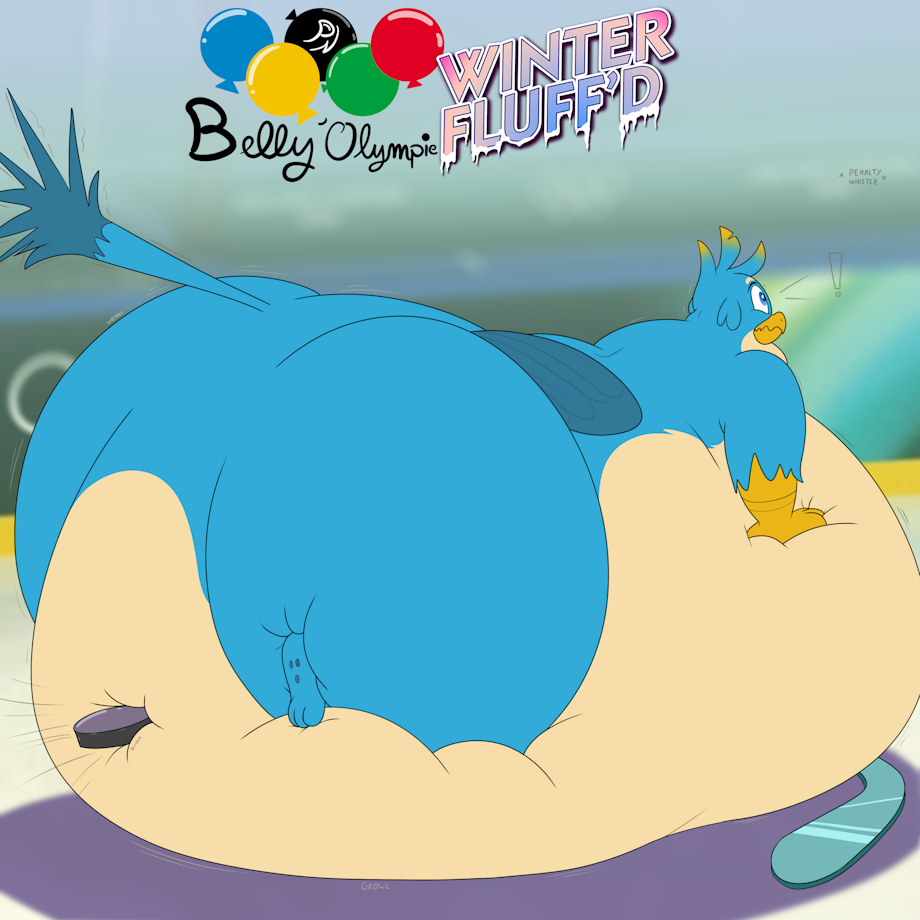 Day 11: Hockey -------- The score is tied, 1-1. Blue catbirb is in possession of the stick and catches the puck. Blue catbird attempts to shoot at the goal! Blue catbirb shoots... then tumbles and falls flat on his face and his butt and gut are wobbling and vibrating very audibly for the entire arena to bear witness. We're so sorry, everybody. And a whistle has just been called for a rather embarrassing timeout. Someone get him a crane... and... maybe refuel what's left of his dignity, while y'all are at it...! 🫣