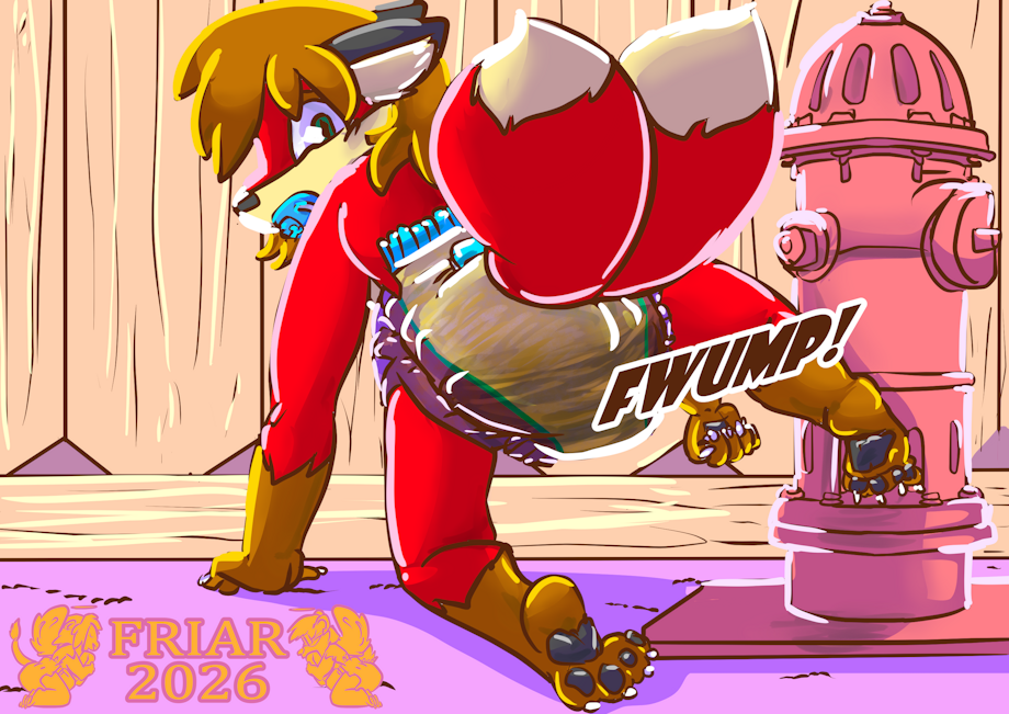 Illustration of Ozzy the diapered two tailed fox lifting a leg and wetting his diaper in front of a toy hydrant.