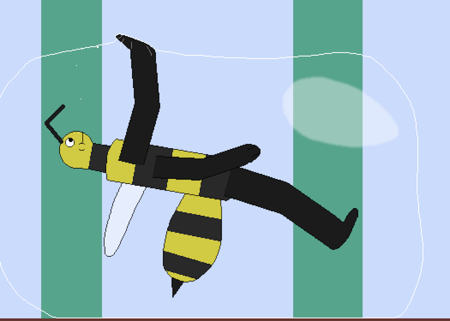On one of the few days off he gets, this bee guy that's a mere inch tall has decided to spend some time indulging in a secret interest of his. It's early in the day, and the morning dew is still around, so he makes use of it by standing under blades of grass and shaking them a little, hoping to get a big drop of water to fall, which never takes all that long. The impact of it against him pushes him inside the drop, where he can swim around for as long as he can hold his breath! The first time this had happened scared him, but with the realization he could pop the droplet by poking it hard with his stinger, he quickly grew to enjoy it.