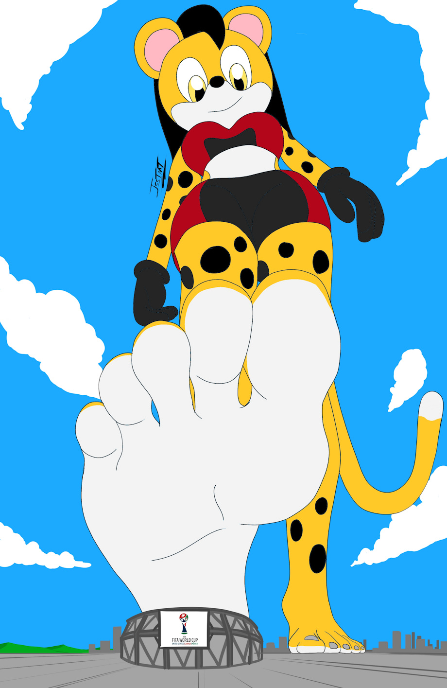 Here's a commission pic of my Mobian OC gal Kathy the Cheetah about to stomp on a stadium that has a billboard advertising the 2026 FIFA World Cup being held in the United States, Canada, and Mexico.