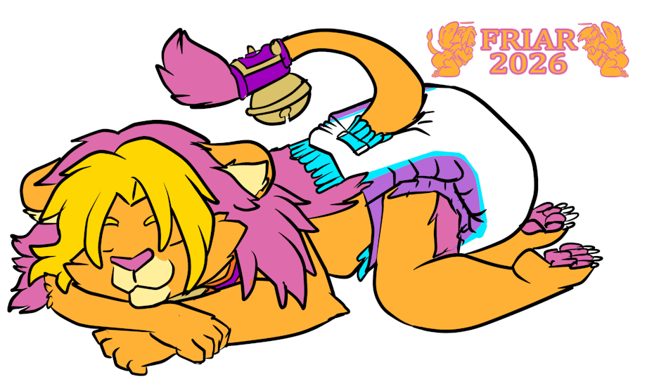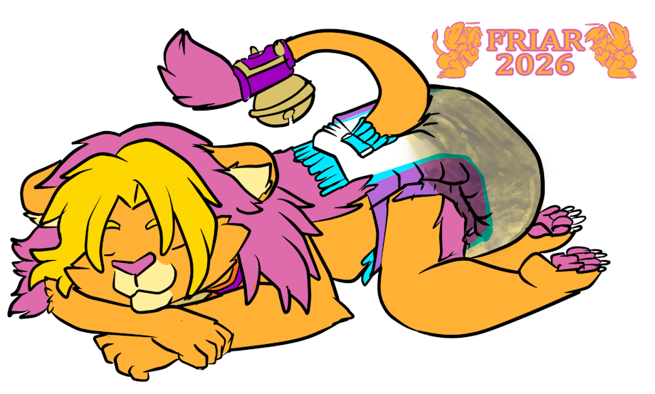 Illustration of Friar the wet and messy diapered lion curled up on a kitten bed with his phone by his side, his tail lifted up in the air jingling his tail bell.