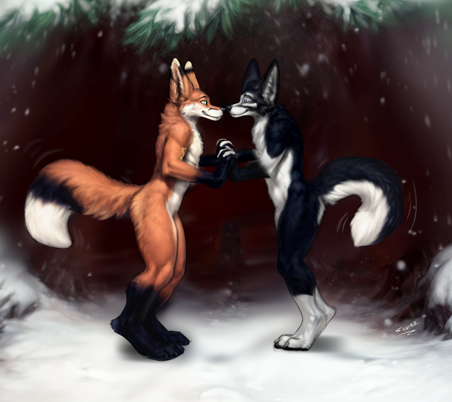 Doon and Bower two foxes going nose to nose in a winter wonderland.
