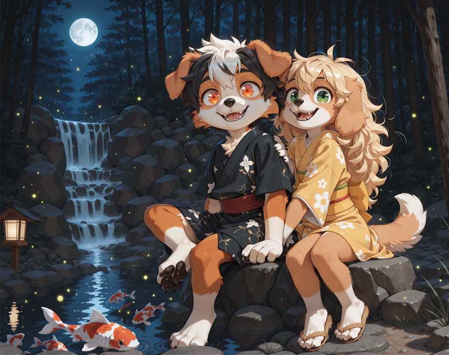 The fireflies drifted closer, the koi swirled beneath their feet, and the moonlit waterfall wrapped the two of them in a quiet, perfect stillness.