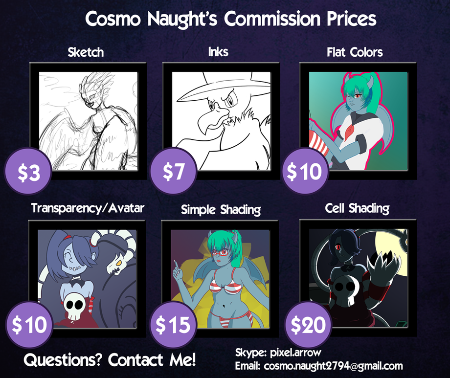 All commission inquiries must contain references to characters (if they are OC’s), and a detailed description of any environments or situations the characters will be in.