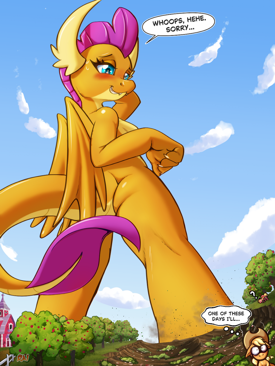 "I'LL GO LOOK AROUND A BIT!" Smolder said happily to someone down on the ground. With that, she turned....and begun to walk directly towards Sweet Apple Acres. And in only a few, booming steps, she was above Applejack...