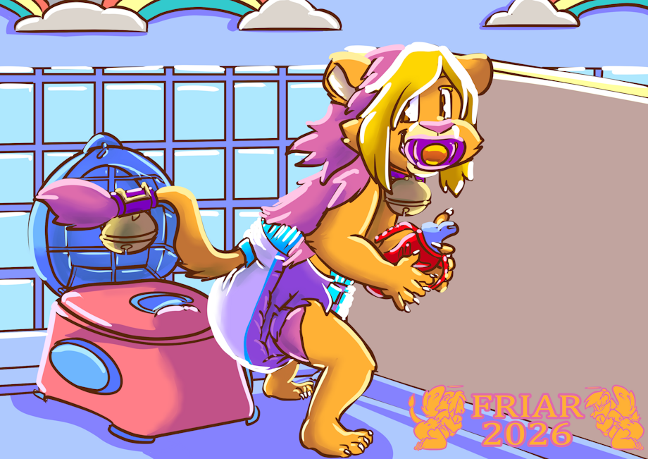 Illustration of Friar the wet and messy diapered lion filling his diaper and holding his sippie cup in the pushies school stall by a training potty. "Can't go potty today, am too baby!"