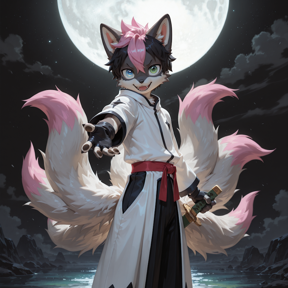 A faint breeze stirs his tails behind him, giving the impression of spiritual pressure rising, subtle, controlled, and impossibly vast. For a moment, the world feels like it’s bending around him, as though he’s already rewritten the ending of the story and is simply waiting for everyone else to catch up.