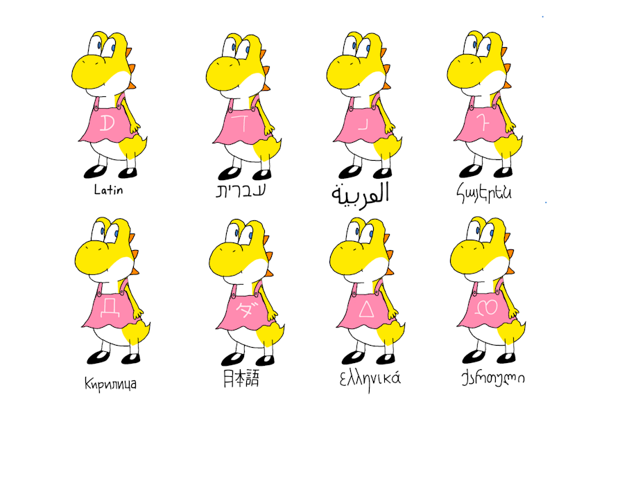 If you don't know what the scripts are here's how to identify them: First Column (From Left to Right): Latin, Hebrew, Arabic, Armenian Second Column (from Left to Right): Cyrillic, Japanese, Greek, Georgian (Hebrew: הדמות שייכת ל-@danel אם אינכם יודעים מהן האותיות, כך תוכלו לזהות אותן: עמודה ראשונה (משמאל לימין): לטינית, עברית, ערבית, ארמנית עמודה שנייה (משמאל לימין): קירילית, יפנית, יוונית, גאורגית)