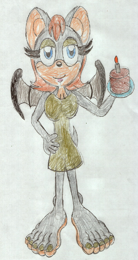 Here we have my Mobian OC gal Melissa the Bat wearing a gold dress and barefoot sporting gold nail polish on her toenails as she presents me a chocolate birthday cake.