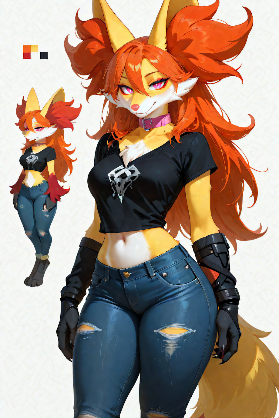 HYPERREALISM, masterpiece, high quality, detailed fur, high detail, 32k_uhd, fine details, intricate details, highest quality, perfect anatomy, perfect face, detailed face, detailed eyes, perfect eyes, very aesthetic, concept art, masterpiece, best quality, amazing quality, ultra-HD, high resolution, ultra-detailed, absurdres, highly detailed, detailed eyes, source_furry, no lineart <lora:(1) FenrisXL Lighting:1> <lora:(1) Mjölnir (SDXL Lighting):1> <lora:photorealistic anthro 2:1> furry (solo, 1girl:1.5) (black short sleeve shirt, jeans:1.4) <lora:character_Sheet_XL:0.8> character sheet, Multiple views, simple background multiple expressions, different emotional expressions, looking at viewer <c4s3y> A (female:anthro:teen:voluptuous:delphox1.4), (orange hair:1.4), (red eyeliner:1.5), (black forearm:1.4), (yellow fur, white belly:1.3), (big ears:1.3), (medium breasts:1.3), (chest tuft:1.4), (pink eyes, black pupils:1.3), (long hair, hair between eyes:1.3), (black tipped ears, yellow highlights:1.5), (pink nose, pink collar:1.2), (thick thighs:1.3), (slim waist:1.3), (digitigrade:1.3) Negative prompt: bloodshot eyes, arms behind back, hands behind back, blurry, blurry background, bad anatomy, bad hands, three hands, three legs, bad arms, missing legs, missing arms, poorly drawn face, bad face, fused face, cloned face, worst face, three crus, extra crus, fused crus, worst feet, three feet, fused feet, fused thigh, three thigh, fused thigh, extra thigh, worst thigh, missing fingers, extra fingers, ugly fingers, long fingers, horn, realistic photo, extra eyes, huge eyes, 2girl, amputation, disconnected limbs, worst quality, normal quality, low quality, low res, blurry, text, watermark, logo, banner, extra digits, cropped, jpeg artifacts, signature, username, error, sketch ,duplicate, ugly, monochrome, horror, geometry, mutation, disgusting, jpeg artifacts, , NEGATIVE_HANDS ac_neg2 p0rnXL-neg DeepNegative_xl_v1 BeyondV3-neg Steps: 30, Sampler: DDIM, Schedule type: SGM Uniform, CFG scale: 3, Seed: 1077798979, Size: 512x768, Model hash: 1a859ef789, Model: NOVAYiffymix_v62, Denoising strength: 0.25, ADetailer model 2nd: face_yolov8s.pt, ADetailer confidence 2nd: 0.3, ADetailer dilate erode 2nd: 4, ADetailer mask blur 2nd: 4, ADetailer denoising strength 2nd: 0.4, ADetailer inpaint only masked 2nd: True, ADetailer inpaint padding 2nd: 32, ADetailer version: 25.3.0, Hires upscale: 1.5, Hires steps: 20, Hires upscaler: 4xUltrasharp_4xUltrasharpV10.pth, Lora hashes: "(1) FenrisXL Lighting: c49df8024095, (1) Mjölnir (SDXL Lighting): 368d428918ac, photorealistic anthro 2: bed53d4c8b68, character_Sheet_XL: 4c59246e5115", TI: "NEGATIVE_HANDS, ac_neg2, p0rnXL-neg, DeepNegative_xl_v1, NEGATIVE_HANDS, ac_neg2, p0rnXL-neg, DeepNegative_xl_v1", Version: f2.0.1v1.10.1-previous-224-g90019688 |