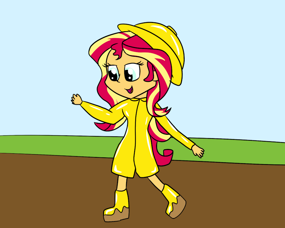 Sunset shimmer love to play in the mud in her yellow raincoat and pvc rainboots.