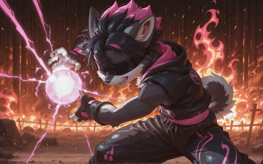 A pulse of pink energy flickered in his palm, small at first, like a spark caught between his fingers. Then it grew, swelling with each breath, each memory, each reason he refused to fall here. The ground trembled as the orb brightened, crackling with arcs of raw power that danced up his arm and lit the forest in neon light.
