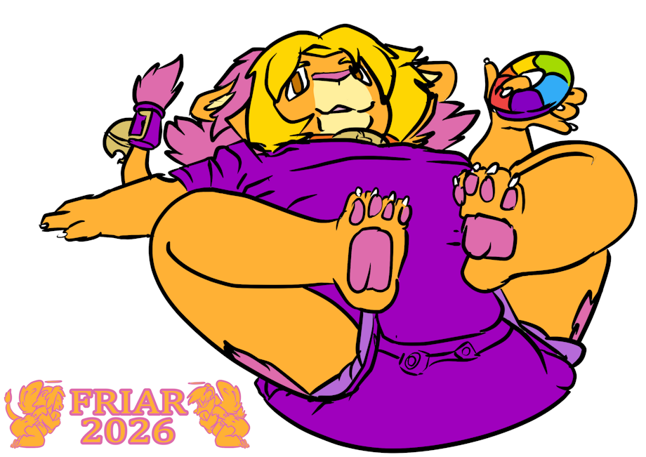 Illustration of Friar the wet and messy diapered lion flopped on his back in a bassinet while holding a rainbow teething ring and wearing a tight purple onesie.