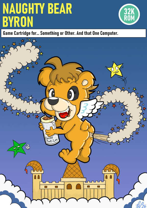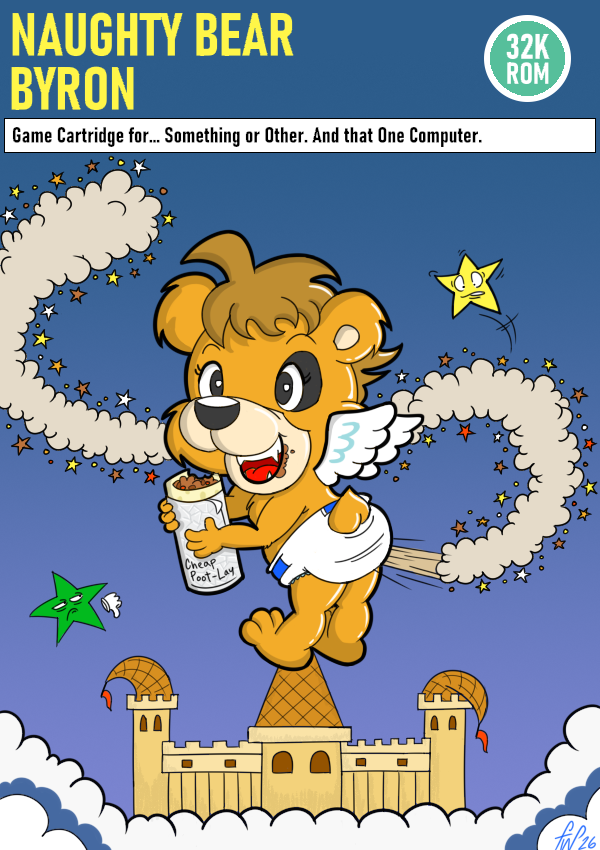 Anyway! Among the many images in the game is a mock up of an SG-1000 (Japanese ColecoVision) title with an angel surrounded by a ripple of stars. The way Sega's artists drew it made it look kind of like the stars were coming out of his butt, so I ran with that idea. Provided are both the InkBunny version, and the other places version, even though there isn't anything particularly risque about it... the angel in Segagaga was nude too.
