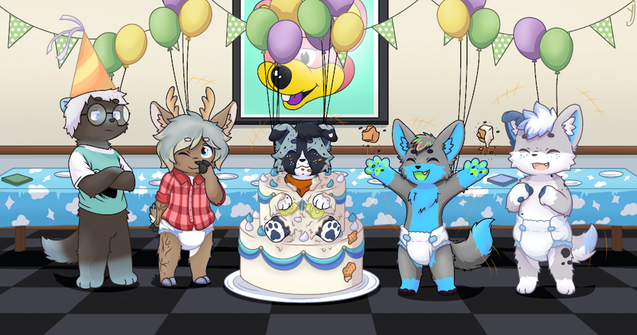I created a cute and detailed illustration for Feesh featuring his four children: Leo Barkley, Bubbles, J, and Shay at his favorite birthday spot.