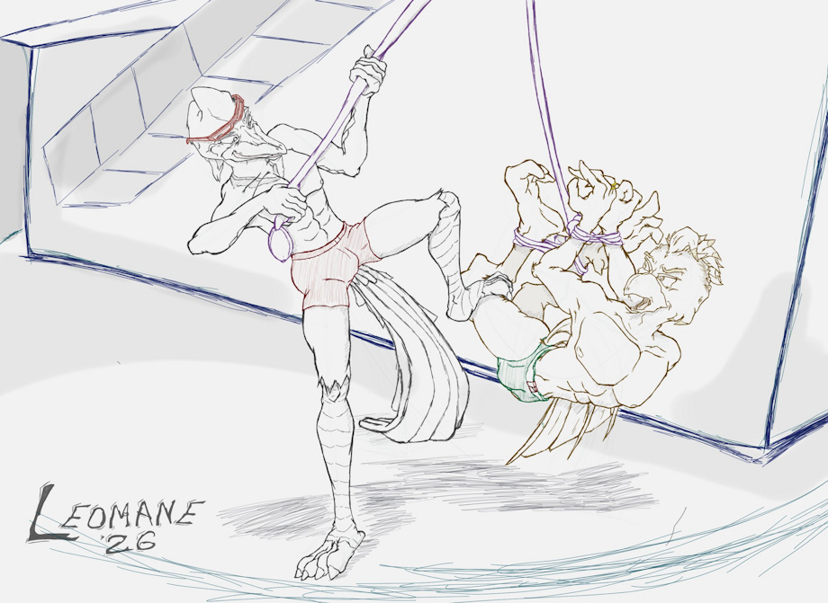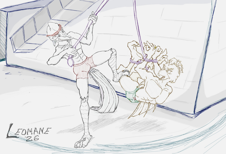 Anyway pretty happy to give a challenge time time as Yuga's pose is pretty complex and was fun to draw once again Mure reprises his roll as master acquisitionist while Yuga uhhh well Yuga is prey, science cant help when you're bound ( sometimes ) again same deal its far more for fun and like a covert capture mission / gladiator style TV show.