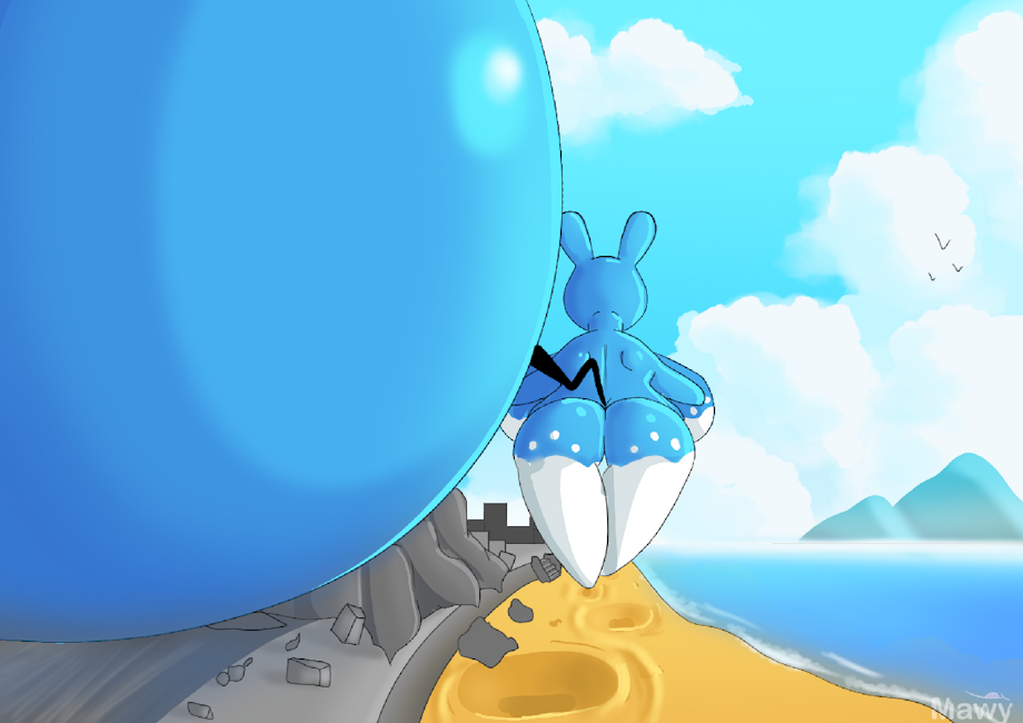Arazuna the azumarill! A anthro azumarill walking around the beach, with her bigggggg tail bulldozering everything behind her <w<