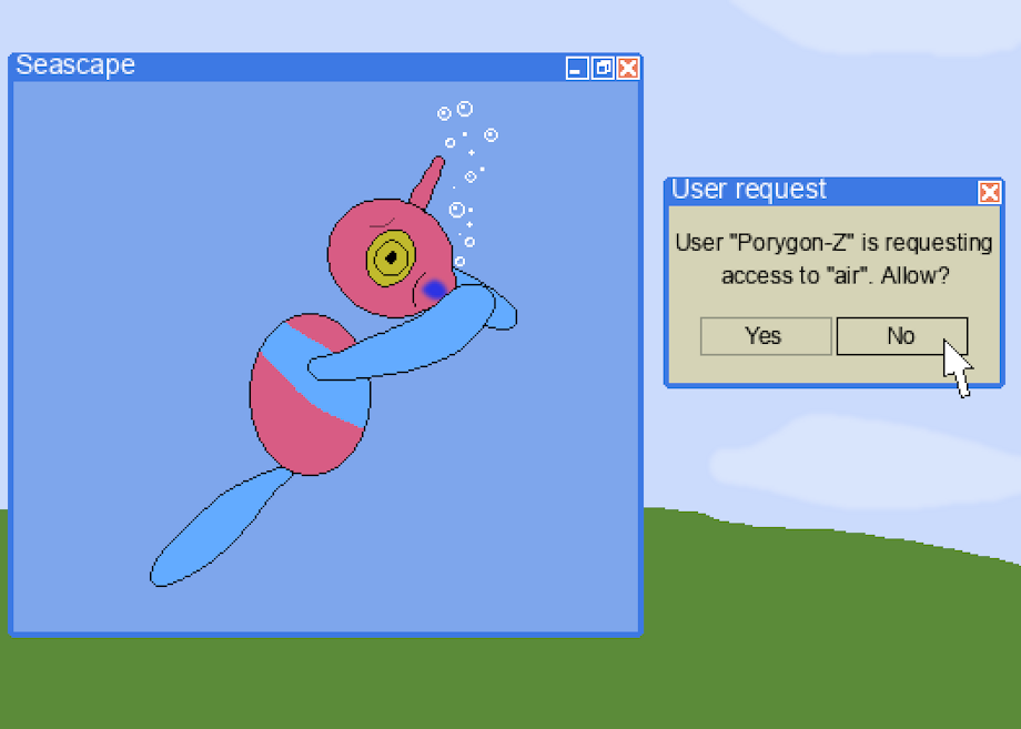 This poor porygon-Z belongs to a rather harsh trainer, and although it tries its best to keep them happy - which isn't too hard, it's been trained well - sometimes there's just nothing it can do. Today, it's ended up losing a fairly important battle, and its trainer has decided it deserves punishment for that. Loading the porygon-Z onto their computer, they quickly forced it into a simple program that's basically just an underwater background... But that's enough to trigger code in the Pokemon that makes it act as if it's underwater. While it doesn't really need air, it feels like it does, and from past experiences it knows that it can "drown" as well. As the minutes went by, it repeatedly asked to be let out, but was denied each time...