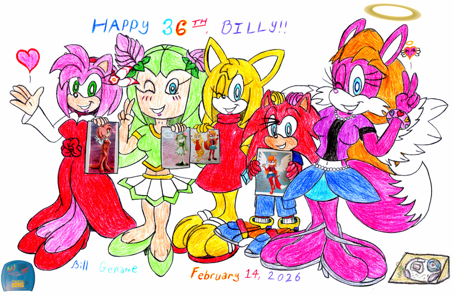 So for my 36th birthday, from left to right, Amy, Cosmo, Zooey, Billy, and Seraph Lisa, all smiles, show off the pictures signed by Ortiz, Birnbaum, and Colleen along with the Sonic board game (bottom left), and my Cosmo keychain (seen with my Wheel of Fortune Live Play game at the bottom right).