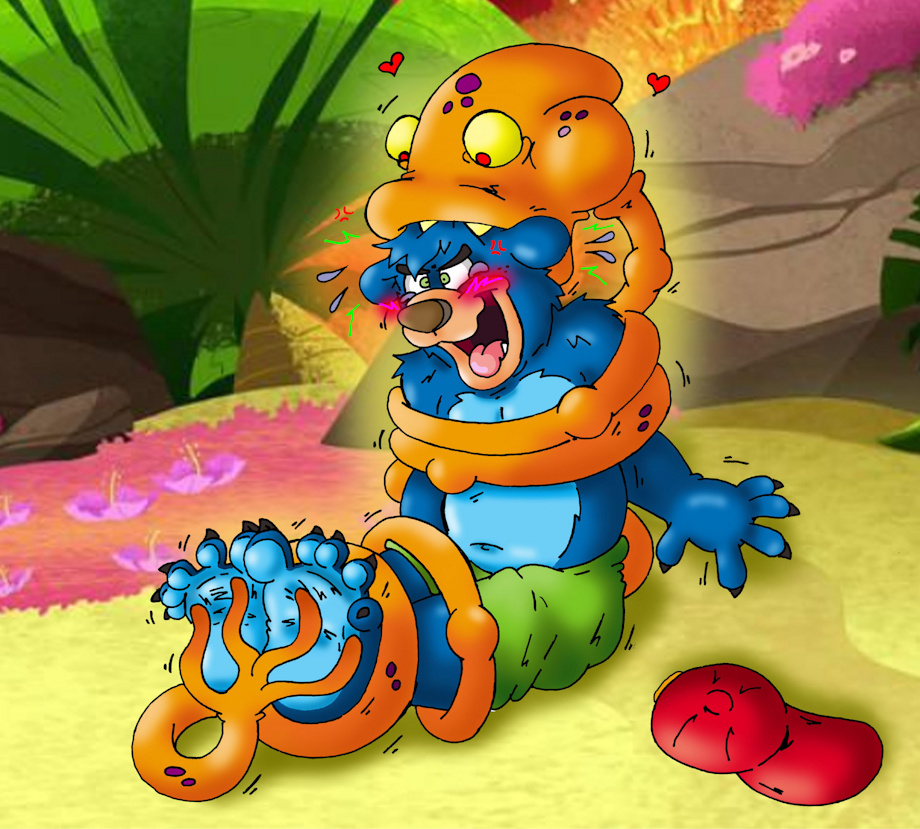 ...Not sure what type of creature got itself latched onto Brett's noggin' but it's making sure he's quite comfortable with some coils and tickles! Seems his hat wasn't a very effective helmet!~ x3
