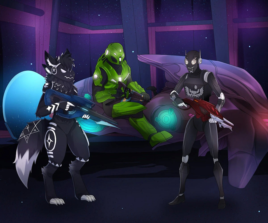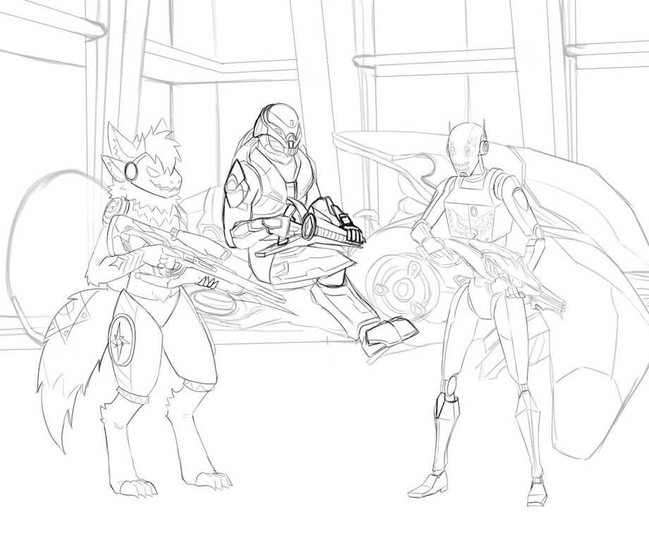 This one features a tactical trio posted up in what feels like a spaceport hangar ready for deployment. I really wanted to push a cool neon palette with the teal glow from the ship contrasting against the darker purples of the environment