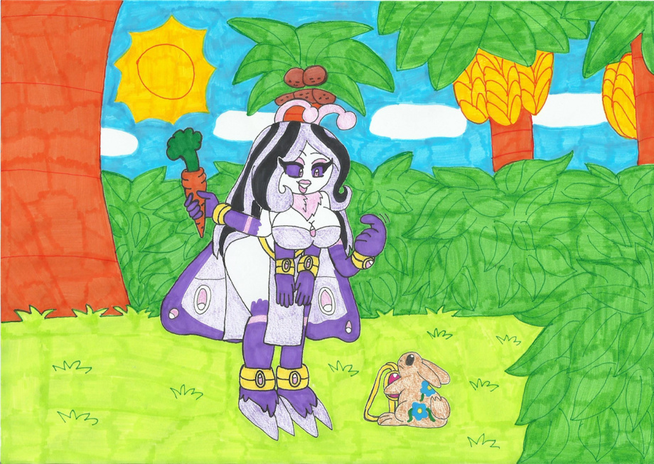 Here is a concept art of Fatima the Monapylion trying to persuade the unconvinced flower bunny to give her the priceless necklace she found during the treasure hunt. I can imagine the dynamic between Fatima and the flower rabbits would be like siblings like Flynn Rider and Maximus the Horse from Disney's Tangled 2010 or maybe Megara and Pegasus from Disney's Hercules 1997. I can also imagine her calling the flower bunnies cute little furrballs.