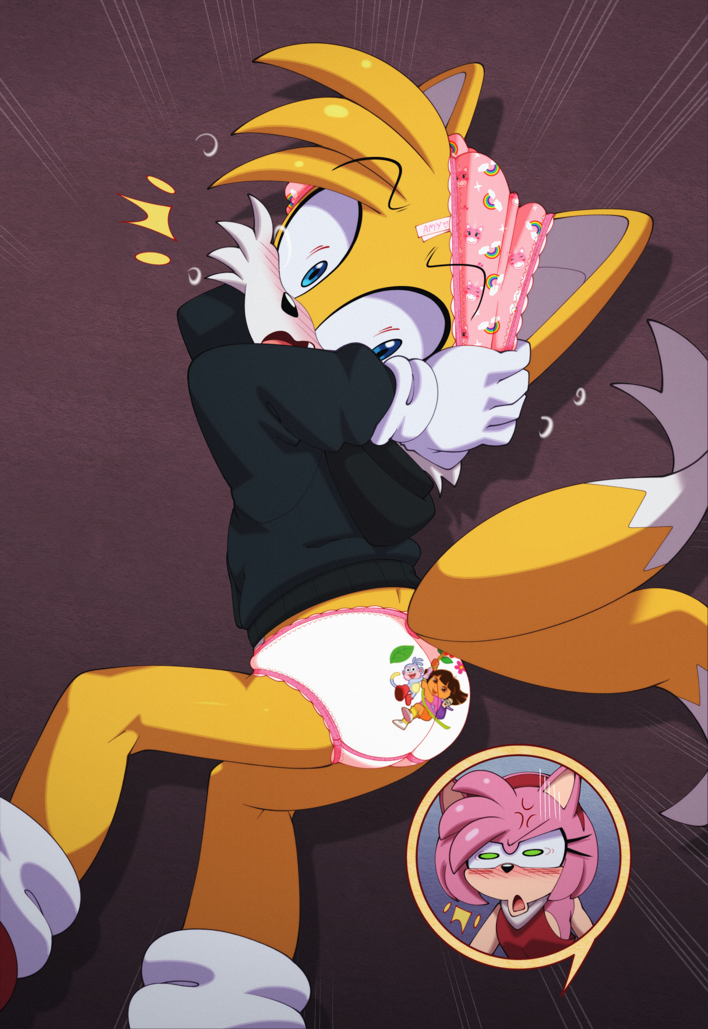 Amy shoves a hand into her pocket and pulls out a pair of Paw Patrol briefs. He showed them to Tails and his eyes widened. He instantly recognized them, seeing his name was sewn into the waistband.