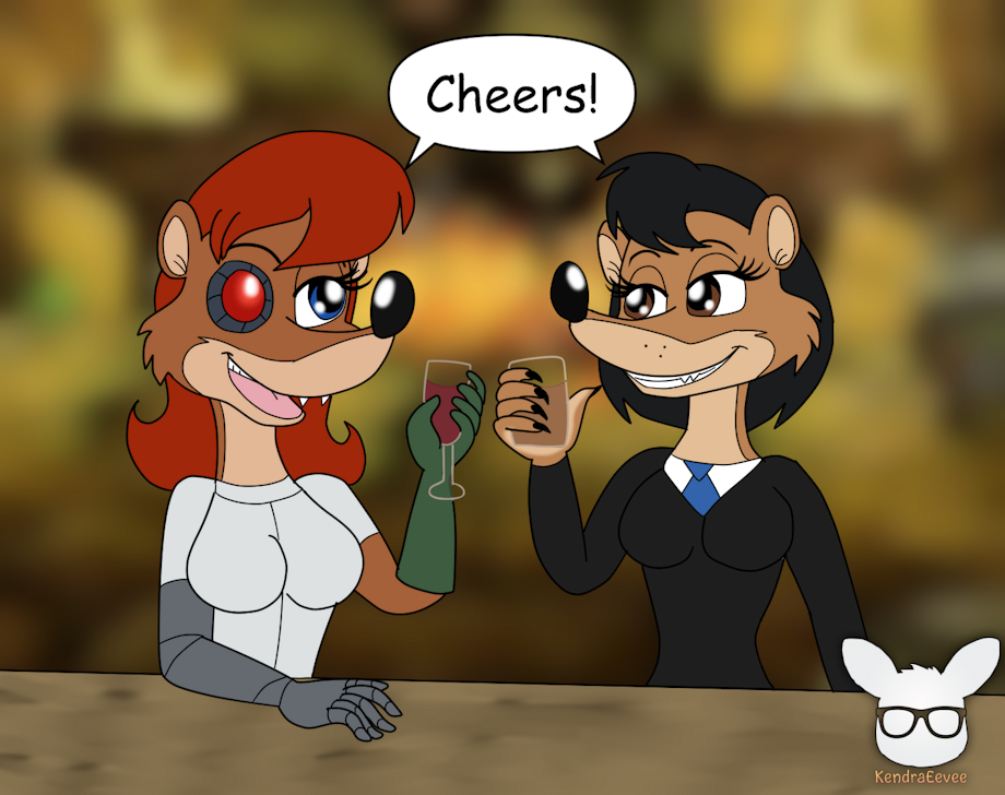 In celebration of Conker's Bad Fur Day's 25th anniversary, Elsa Von Kriplespac (daughter of Professor Von Kriplespac) and Gianna Weaso (Don Weaso's niece) are having a drink at the Cock and Plucker for a weasel girls' night out.