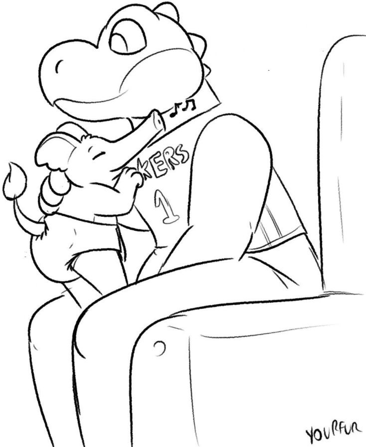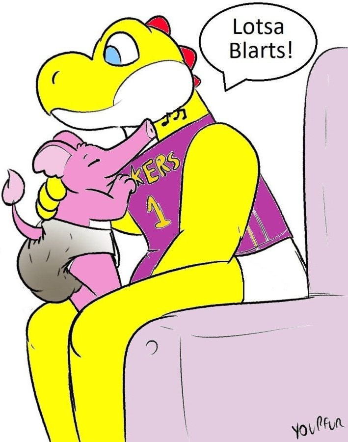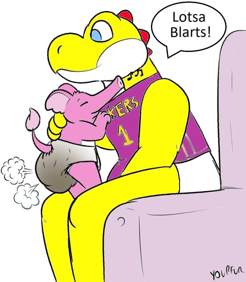 Showtime hugging Lotsa Heart as she trumpets, farting and messing her diaper.