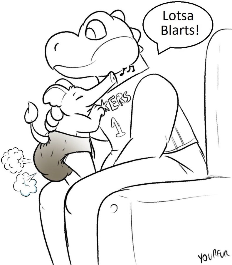 Showtime hugging Lotsa Heart as she trumpets, farting and messing her diaper.