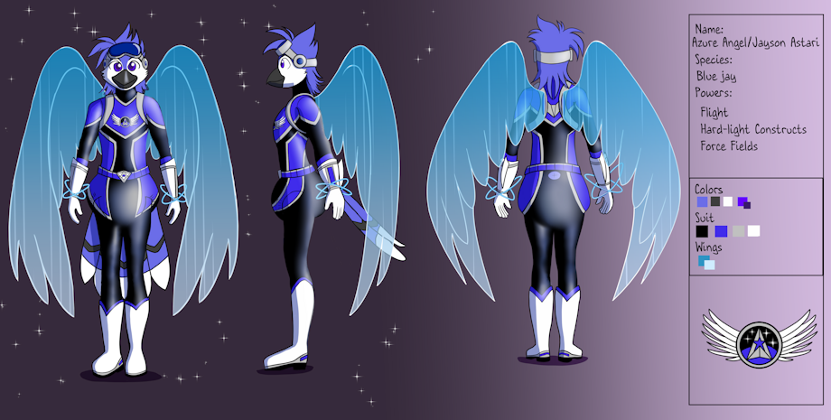 Decided to try and design a "Universe-agnostic" version of Jayson's "hero-sona"; since Blue Lanterns are inherently tied to the DC universe.  Also leaning more into the bluejay's space/techy theme; making his wings and sof orth have a bit more obvious technology elements than the semi-magic of the Lantern Corps rings.  And hey; there's even a sneaky Star Wars reference in there for my fellow turbo-nerds.