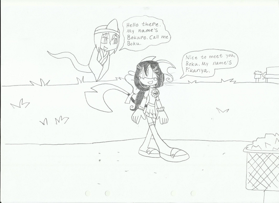Note: The ghostcharacter named Bokuro belongs to Motoneko. This art with Bokuro interracts with Pikanya is drawn around 2009-2010. I drew that at school.