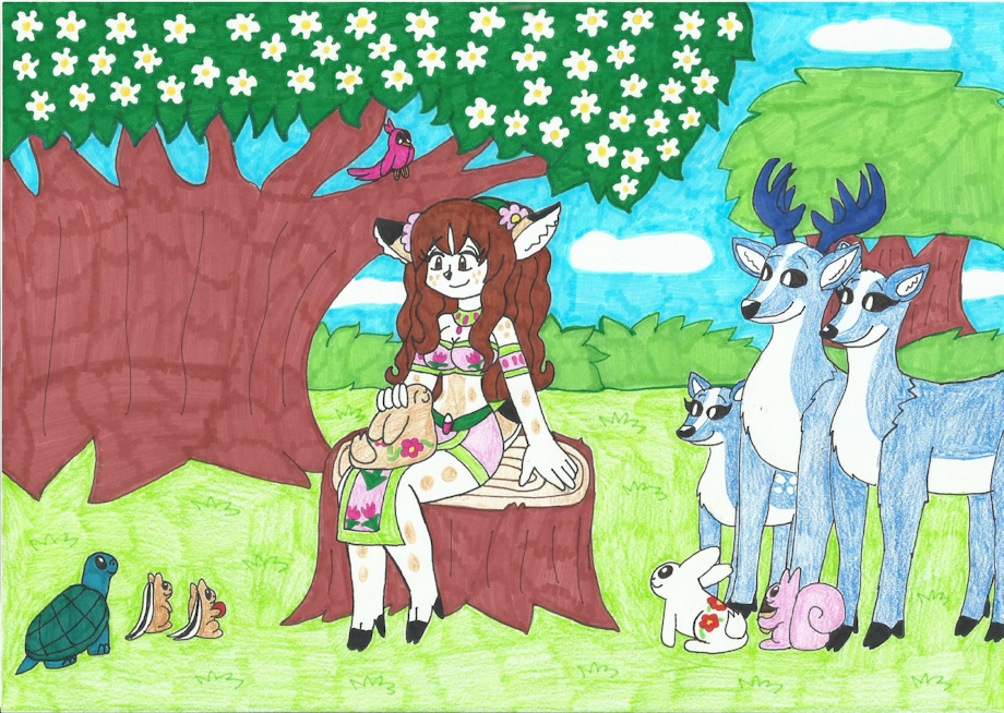 Anyway, While Vera sat onto a stump, she talked to the forest animals she's friends with. Telling stories and the animals listenend to her.