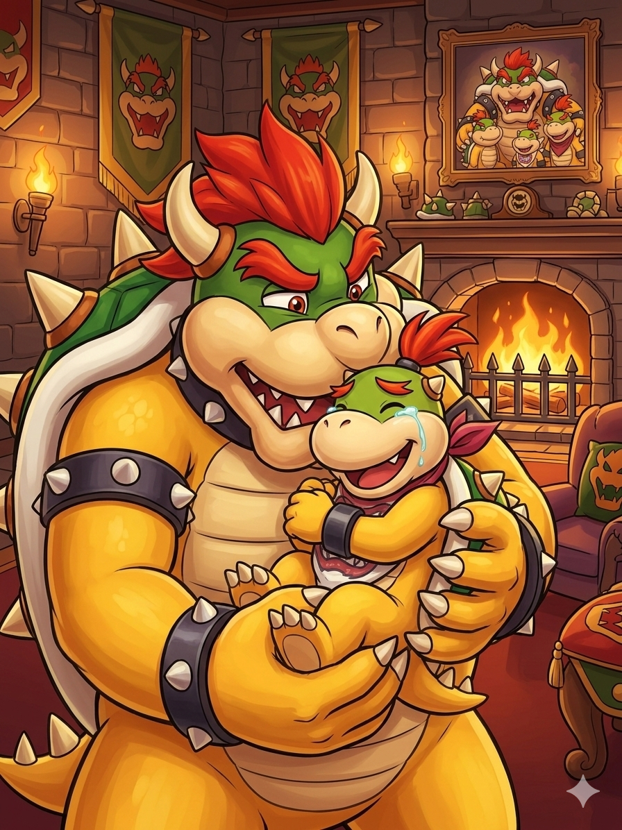 yo solo quise compartir una imagen con la que estuve experimentando, realmente quisiera poder dibujar asi, pero eso no quita que al menos para mi la escena sea tierna y creo que transmite el sentimiento y queria crear algo que demostrara el amor que tiene bowser hacia su hijo