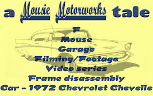 "Alright, we live? We-e-e're live. Hey ho all you wonderful people out there in Youtube land! Missy here from Mousie Motorworks, with yet another exciting episode! We're getting right back into yanking apart that poor seventy-two Chevelle! As you can see behind me, the body is now gone, and the frame is back on the lift. And look over there in those racks; I've already fully taken apart the doors and stripped everything off the trunk lid and the body, so that's all done now and they're ready for media-blasting. We'll get to that, but first, there's still this frame to take apart! And now you can see why I left the engine and transmission in place when I took the body off the car, because look how easy I can reach everything now! No need to stand under the car and reach up above my head to pull the driveshaft and trans, no need to do a silly dance with an engine hoist to pull the engine out of the engine bay, I can just sit on top of that frame and take everything off from there. So we will be doing just that, right here at Mousie Motorworks!" A calm count to three to give herself an editing point, and then Missy moved the cameras in position and turned to the frame of the car. "This should be simple enough right here; we're almost done! Driveshaft needs to come out, transmission, then we can pluck the motor and put it on a stand, and all that's left is all the brake and fuel lines, the rear axle and all the suspension bits and pieces. I don't even have to be all too careful with yanking those off, because I will be replacing pretty much all of it with upgraded parts. So let's get started! Cue the timelapse!"
