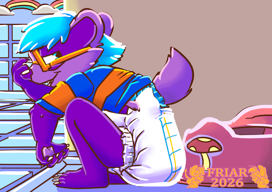 Illustration of Everett the wet and messy diapered badger crouched next to a training potty in the pushies school nursery stall, pushing up his glasses. "As you can see, potty training isn't for me."