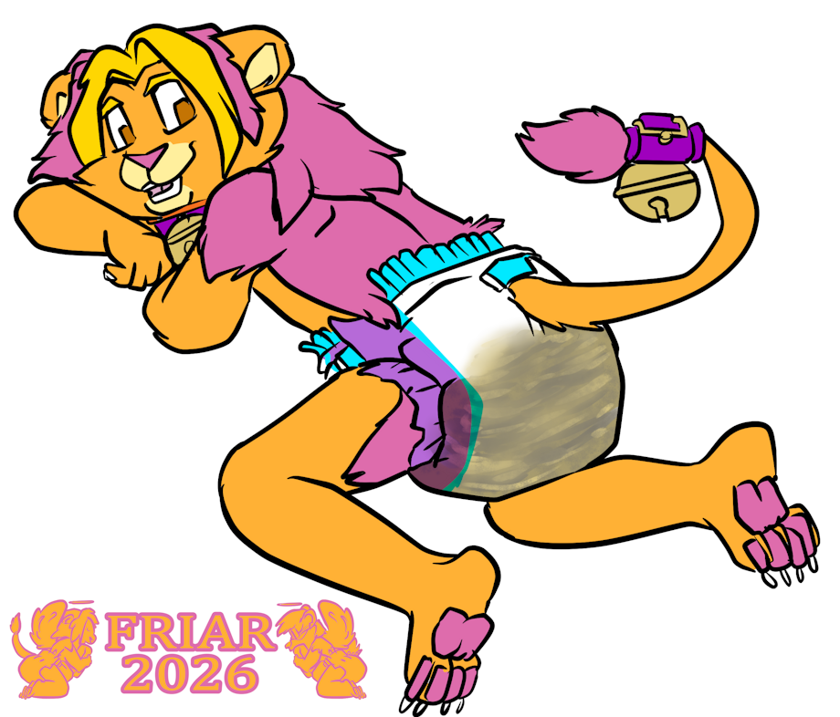 Illustration of Friar the wet and messy diapered lion flopped on his race car bed looking at the viewer. "Do you mind? I'm kinda busy lion around."