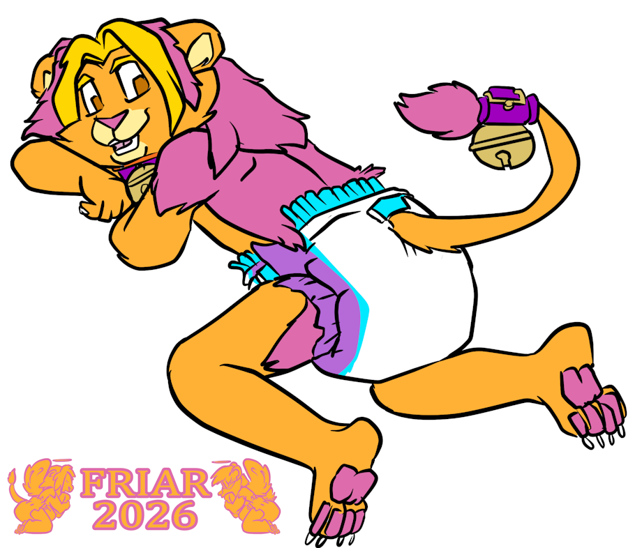Illustration of Friar the wet and messy diapered lion flopped on his race car bed looking at the viewer. "Do you mind? I'm kinda busy lion around."