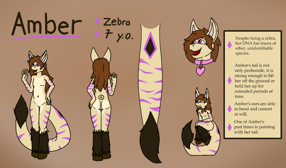 Amber looks like a relatively ordinary zebra, with cream fur, brown hair, chocolate brown leg tuffs, and a matching tuff at the end of her tail. What sets her apart, however, is her large tail, one that is about as long as her. Her tail is prehensile, meaning she could not only carry things with it without struggle, but it is thick and strong enough to lift her off the ground with ease. Her ears are also unique in that they can bend in different ways, allowing her to emote with them far more extensively than most zebra girls her age.