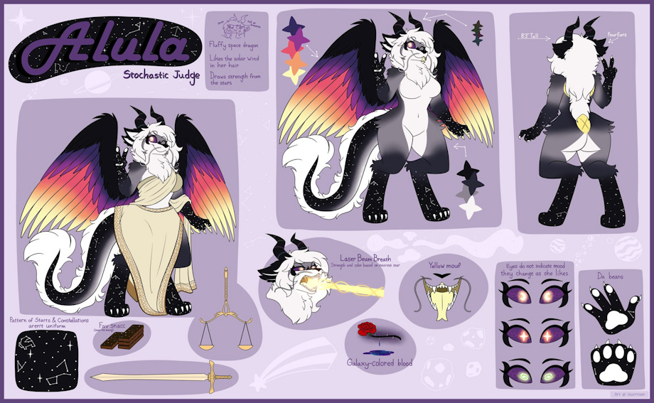 Alula is a majestic, fluffy space dragon who draws her power from the stars. With constellation‑patterned fur, shifting cosmic eyes, and wings glowing like a nebula, she roams the universe as a stochastic judge, guided by celestial energy.