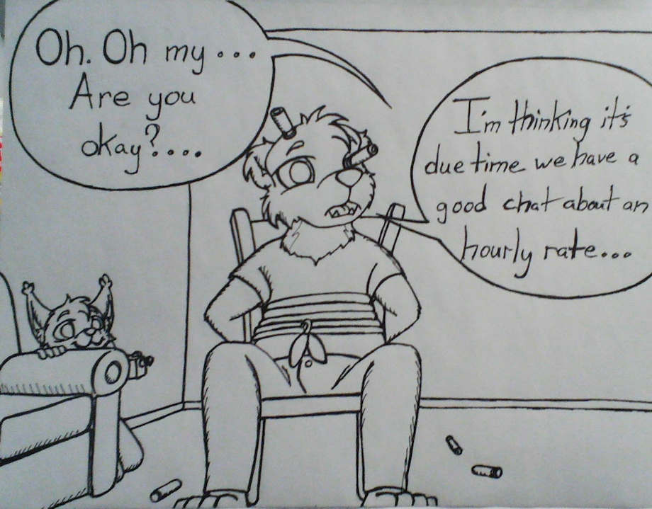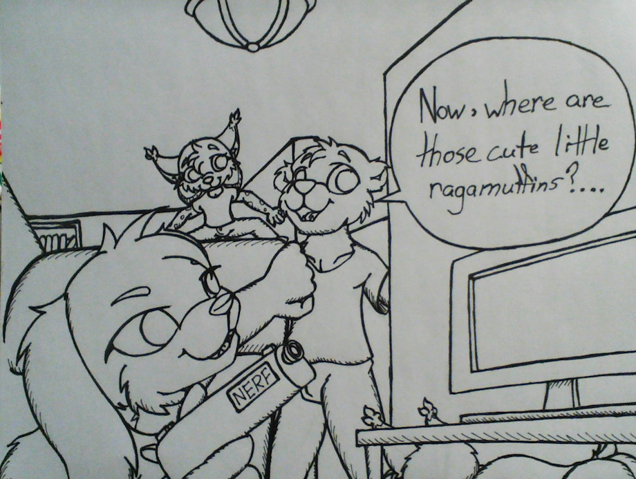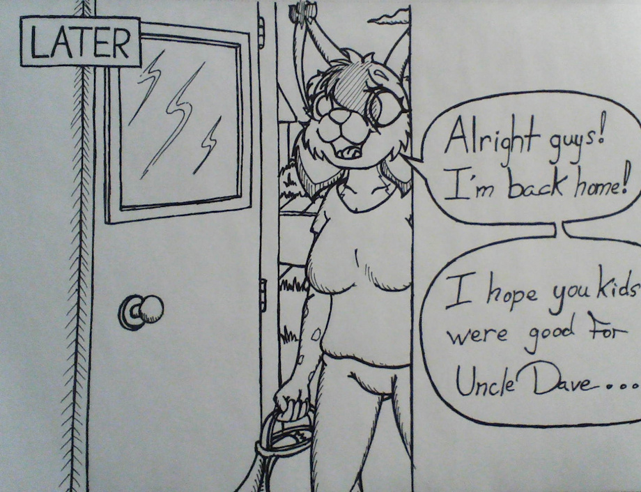 Made a silly little 5 page comic at work in my doodle book. Uncle Dave (me!) gets roped in by Rebecca to babysit for a while while she does her own thing. Seems the Lynx Twins and Bailey were feeling a little too rowdy that day, and Mr Bear ends up in a twisted turn of events from their knotty hands.