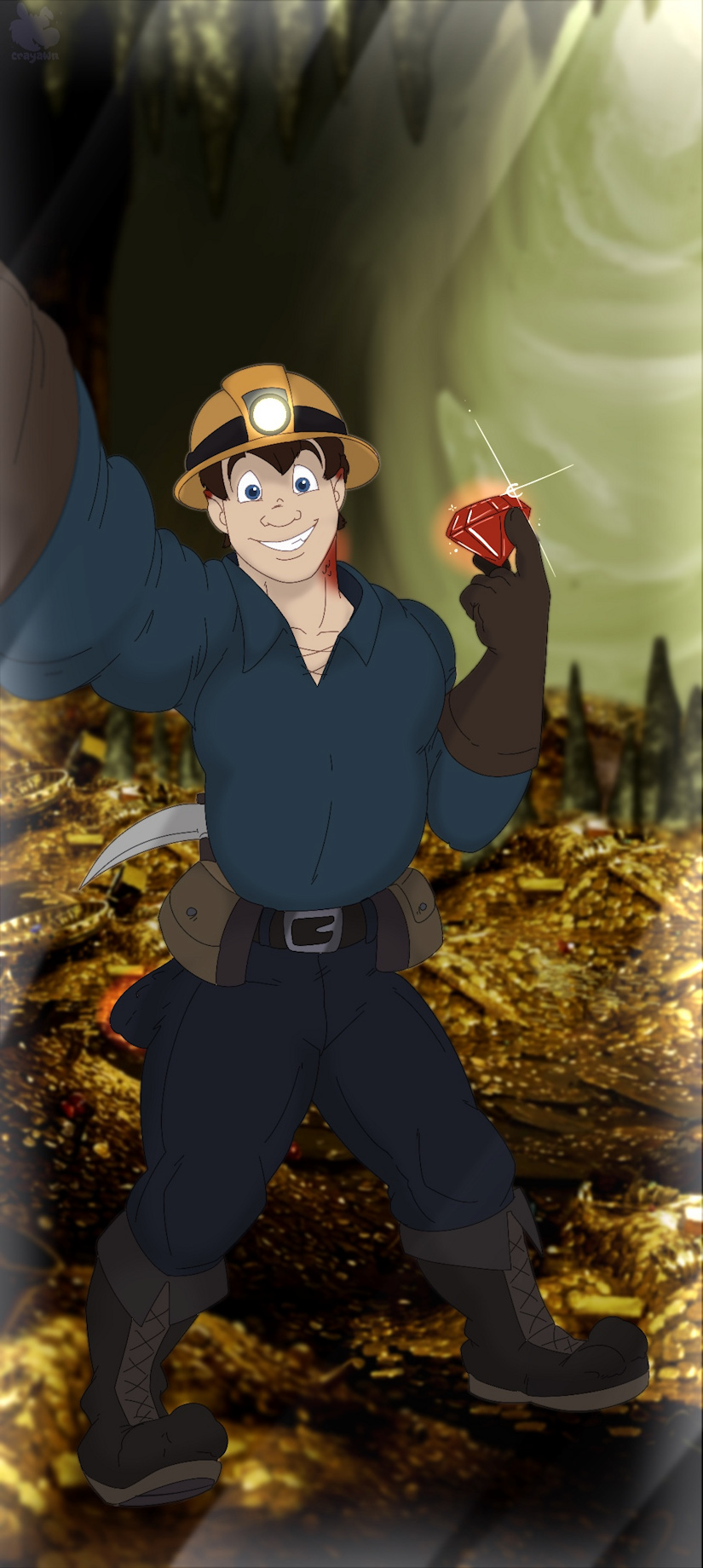 My body continued to expand outwards, putting immense strain on my outfit, until the cloth couldn't hold on anymore. Suddenly, my shirt, pants, belt, gloves, underwear, and boots all burst into a million pieces, as my broken helmet flew off my head, and I heard a crunch as I accidentally stomped on my precious ruby! I stared, helpless, as my phone fell into the gold pile in front of me, probably soon to be buried under a massive gold pile!