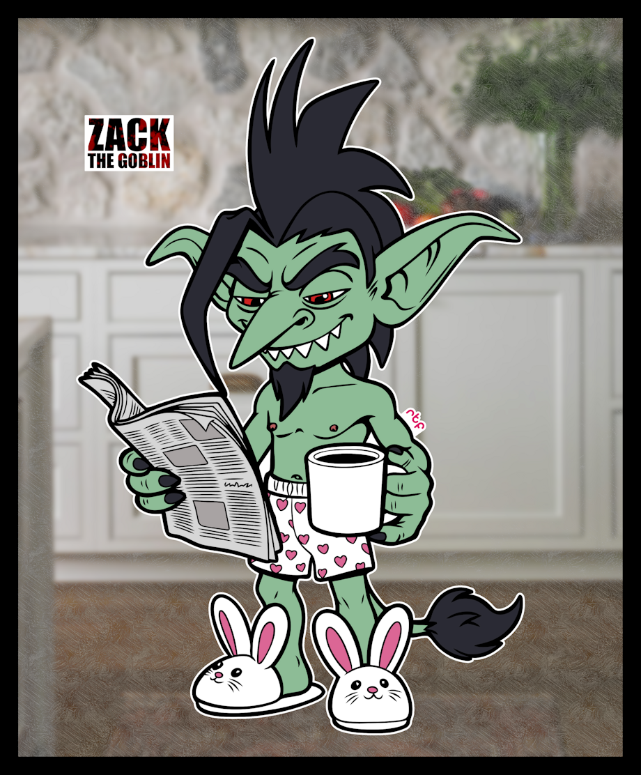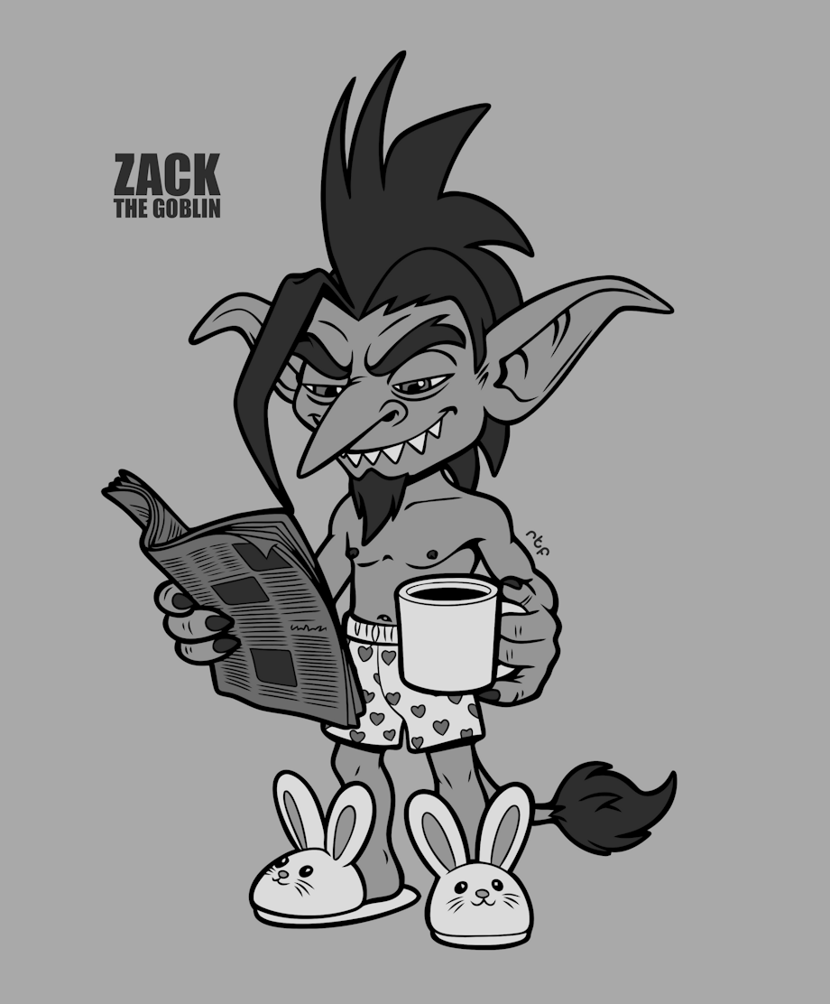 Zack the Goblin is a malevolent, serial-killing mythical creature—the artist's alternate version of Satsuriku no Tenshi's Isaac Foster—with ties to Hugo the Screen-Troll and Booba. He is a green-skinned goblin with red eyes, a black mohawk, and a tail, who revels in dangerous activities and spreading chaos. Zack possesses bizarre abilities, including transforming his brain into insectile antennae to intercept communications and wielding his flexible intestines as weapons. He can also assume a human form. Zack resides in a lavish nest in a tropical region, complete with a greenhouse, a portal to the underworld, and an intergalactic space cruiser, showcasing his engineering skills and eccentric lifestyle. He is devoted to his wife Rachel, vowing to reap the world of its civilizations so she may be forever happy.