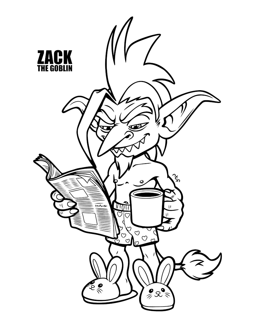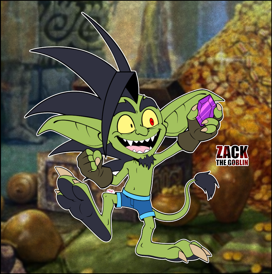 Zack the Goblin is a malevolent, serial-killing mythical creature—the artist's alternate version of Satsuriku no Tenshi's Isaac Foster—with ties to Hugo the Screen-Troll and Booba. He is a green-skinned goblin with red eyes, a black mohawk, and a tail, who revels in dangerous activities and spreading chaos. Zack possesses bizarre abilities, including transforming his brain into insectile antennae to intercept communications and wielding his flexible intestines as weapons. He can also assume a human form. Zack resides in a lavish nest in a tropical region, complete with a greenhouse, a portal to the underworld, and an intergalactic space cruiser, showcasing his engineering skills and eccentric lifestyle. He is devoted to his wife Rachel, vowing to reap the world of its civilizations so she may be forever happy.